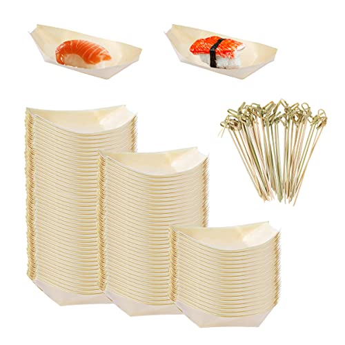 WATHFKCU 3.5 Inch Disposable Bamboo Wooden Sushi Boat Plate Bamboo Appetizer Plates Dishes Sushi Serving Tray Wooden Leaf Boat with 100Pcs Bamboo Picks