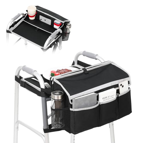 Walker Bags for Folding Walker | Upgrade Accessories - Basket with Cup Holder and 2 Trays for Seniors Detachable to Carry Things | Large Capacity Carry Storage Carrier Tote