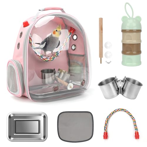 Bird Backpack Carrier, Travel Bird Cage for Small Medium Size Parrot Parakeet Budgies Cockatiel, Portable Clear Bubble Window Bag with Stainless Steel Tray Food Bolw Standing Perch (Pink)