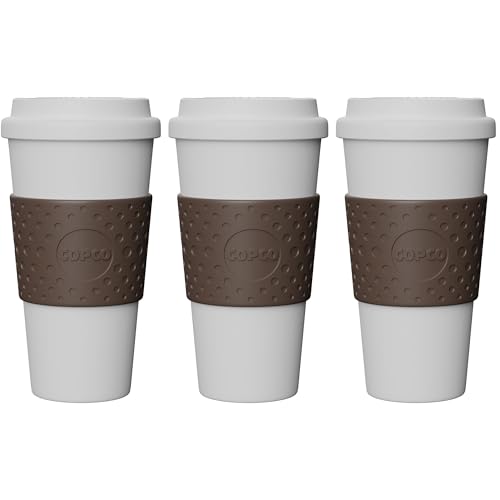 Copco 16 oz Acadia Travel Mug Set – Reusable Double-Wall Coffee Cups with Non-Slip Sleeve & Spill-Resistant Lid for Hot & Cold Drinks, BPA-Free Plastic, 3 Pack Portable Drinkware (Brown)