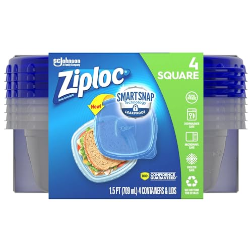 Ziploc® Brand, Food Storage Containers with Lids, Smart Snap Technology, Square, 4 ct