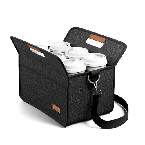 Fluxynara 6-Cup Reusable Felt Drink Carrier with Handle and Adjustable Shoulder Strap, Drink Holder for Car, Multi-Cup Drink Carrier Bag for Delivery, Travel, Picnics (Black)