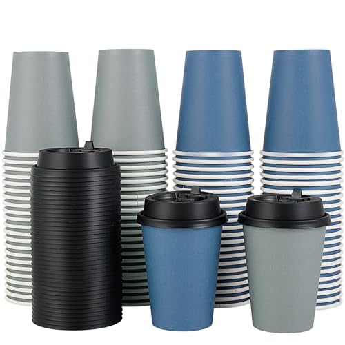LITOPAK 100 Pack 12 oz Disposable Paper Coffee Cups with Lids for Coffee, Water, Juice, or Tea, Blue and Gray Hot Paper Cups for Home, Restaurant, Store, and Cafe
