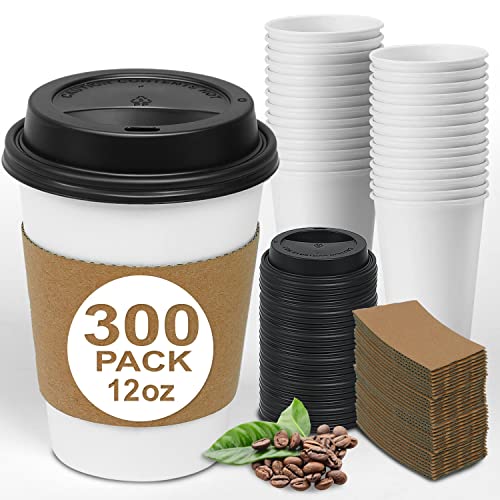 Ginkgo 300 Pack 12 oz Disposable Thickened Paper Coffee Cups with Lids and Sleeves, To Go Hot Coffee Cups Set for Chocolate, Cocoa, Beverages and Tea
