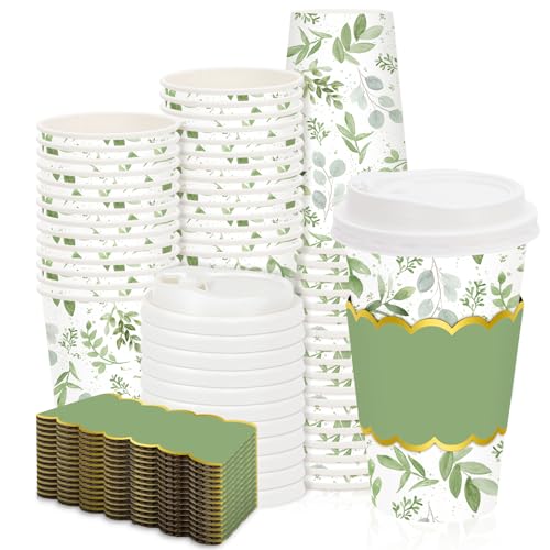 JarThenaAMCS 50Pcs Greenery Coffee Cups with Lids Sleeves 16oz Green Eucalyptus Leaves Paper Cups Disposable To Go Coffee Cups for Wedding Cafes Shops Cappuccino Chocolate Beverage Cocoa