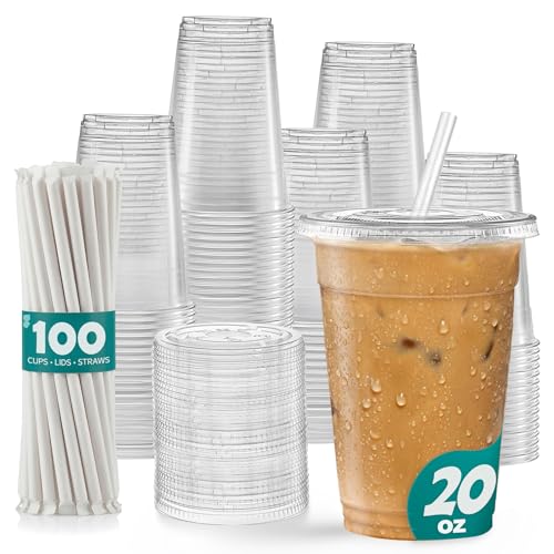 GUSTO [20 oz - 100 Sets Clear Plastic Cups with Lids and Straws – Disposable Iced Coffee Cups for Cold Drinks, Smoothies, Boba, and To-Go Beverages – Sturdy, Easy-to-Separate