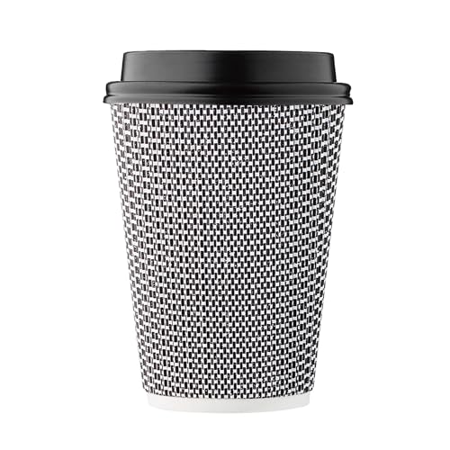 [100 SET]Harvest Pack 12 oz Disposable Coffee Cups, Insulated Ripple Double-Walled Paper Cup with Lids, Black and White Geometric, Tea Hot Chocolate Drinks To go coffee cups