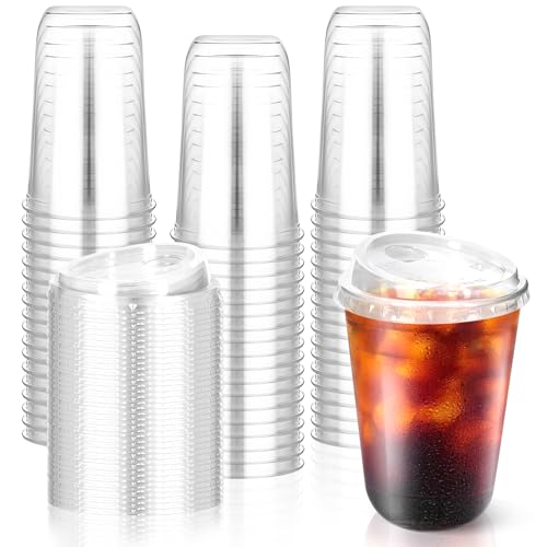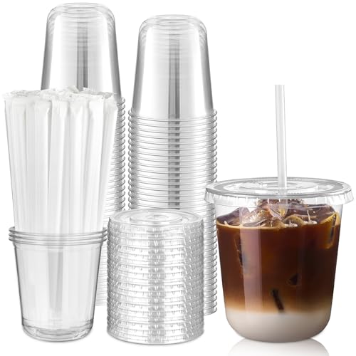 Kesaplan 50 Set 16oz Clear Plastic Cups with Lids & Straws, Disposable Round Bottom To Go Iced Coffee Drinking Cup for Cold Beverage Smoothies Juice Lemonade Slushies Milkshake Party Catering Supplies