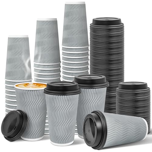 Ginkgo 100 Pack 16 oz Disposable Insulated Coffee Cups With Lids, Double-Walled Ripple To Go Paper Travel Cups for Hot Drinks - Gray