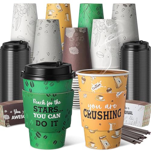 100 Sets 12 oz Disposable Coffee Cups with Lids, Sleeves, Straws, Motivational to Go Paper Cups for Hot & Cold Drinks Chocolate Cocoa Beverage Home Coffee Shop Office, 5 Styles