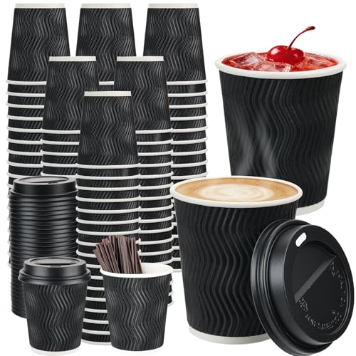 100 Pack 8 oz Disposable Coffee Cups with Lids and Straws, To go Insulated Corrugated Thick Paper Coffee Cups for Hot/Cold Beverages, Ripple Wall Cups for Espresso Coffee, Hot Chocolate and Cocoa