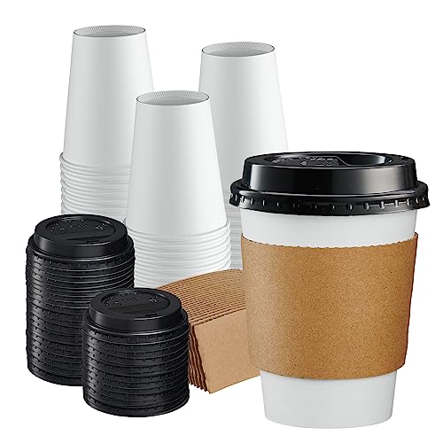 GUSTO [12 oz. - 100 Sets Disposable Coffee Cups with Lids and sleeves - To Go Paper Hot Cups for Travel and Office Use - Formerly Comfy Package