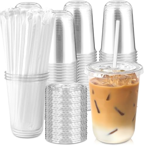 [100 Sets - 16oz Round Bottom Clear Plastic Cups with Lids and Straws, Disposable Iced Coffee Cups with Lids To Go Cold Drink Cups for Smoothies, Juices, Party Catering