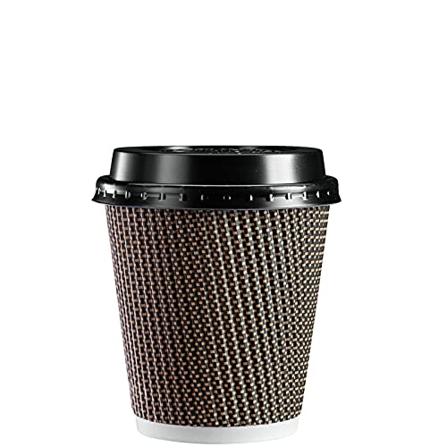 GUSTO [10 oz. - 50 Sets Insulated Brown Patterned Ripple Paper Hot Coffee Cups With Lids (Lids Color May Vary) - Ideal for Hot Beverages, Travel, and Office Use - (Formerly Comfy Package)