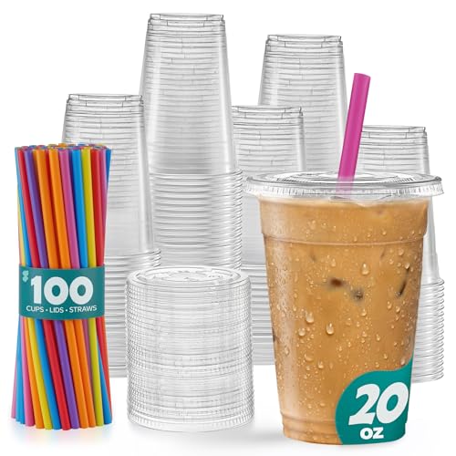 GUSTO [20 oz. - 100 Count Clear Cups with Flat Lids & Straws - Disposable Clear Drinking Cups for Iced Coffee, Cold Drinks, Milkshakes, and Smoothies - (Formerly Comfy Package)