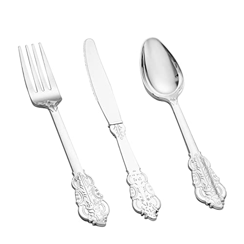WDF 360 Pieces Silver Plastic Silverware- Disposable Flatware - Heavyweight Plastic Cutlery- Includes 120 Forks, 120 Spoons, 120 Knives for Christmas