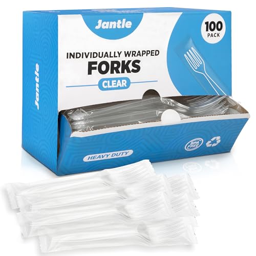Individually Wrapped Heavy Duty Plastic Forks with Dispenser Box, Clear Disposable Spoons 100 Pack - Disposable Utensils for Home, Office, Restaurant, Catering, To-Go Meals - 100 Count (Clear)