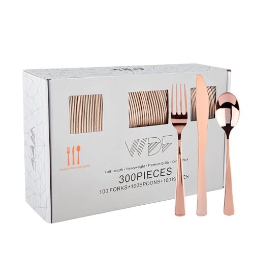 WDF 300 Pieces Rose Gold Plastic Silverware- Disposable Flatware Set - Heavy Duty Plastic Cutlery Includes 100 Forks, 100 Spoons, 100 Knives Perfect for Wedding, Party,Birthday