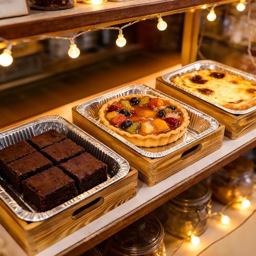3-Pack Wooden Holders for 9x13 Foil Pans - Includes 3 Disposable Aluminum Foil Pans - Rustic Handcrafted Food Carrier - Perfect for Parties, Catering & Home Kitchen - Foil Tray Display Stand