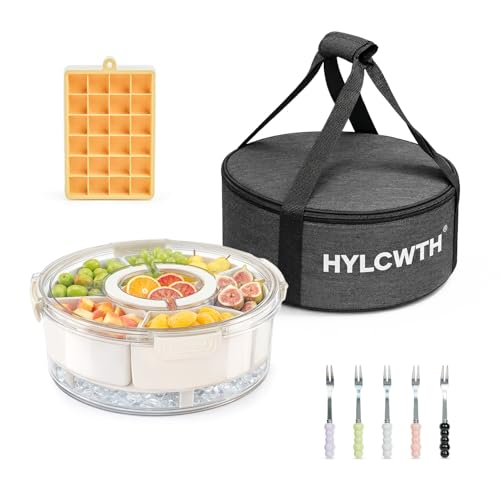 Divided Serving Tray with Lid and Handle, Rounded Snackle Box with 6 Compartments and Chill Base for Fruits, Candy, Veggie, Travel Snack Container with Portable Insulated Bag & Ice Cube Tray & 5 Forks