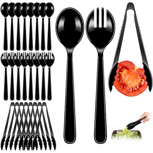 24 Pcs Black Serving Utensils Set For Parties - 8 Tongs, 8 Spoons, 8 Forks - Heavy Duty Plastic Disposable Serving Utensils Set for Buffet, Wedding, Holiday Events Catering Supplies