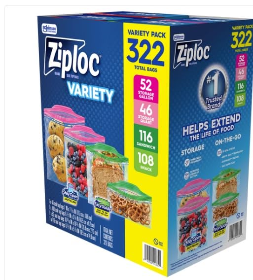Ziploc 306 Count Variety Pack- 34 Freezer Gallon, 52 Storage Gallon, 50 Freezer Quart, 50 Storage Quart, and 120 Sandwich