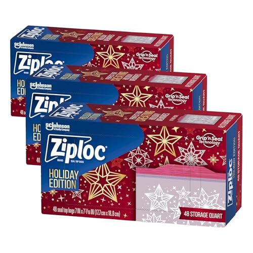Ziploc Quart Food Storage Bags, Grip 'n Seal Technology for Easier Grip, Open, and Close, 48 Count, Holiday Designs, Packaging May Vary (Pack of 3)