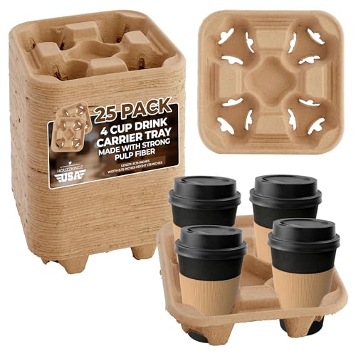 4 Cup Holders Drink Carrier 8-32 oz | 25 Cup Holder Tray Drink Carrier for Delivery Drinks Hot and Cold Beverages – To Go Disposable Compostable Pulp Fiber Restaurant Supplies, Coffee Shops, Uber Eats