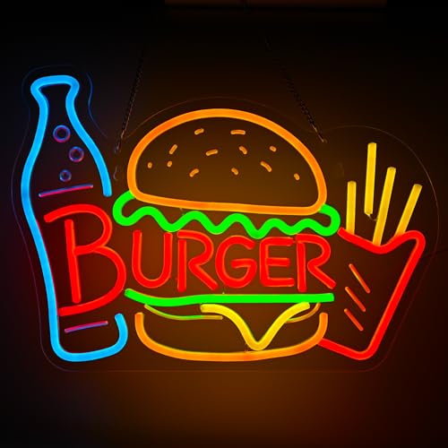 Burger & Fries Neon Sign - Retro Dimmable Fast Food LED Light, Restaurant & Dining Room Wall Decor, Snack Bar Sign, Hamburgers Party Decorations