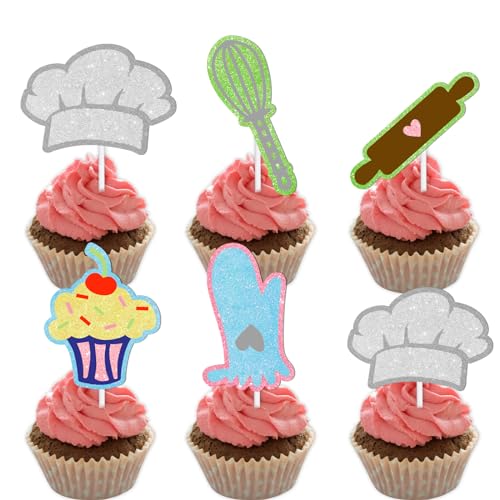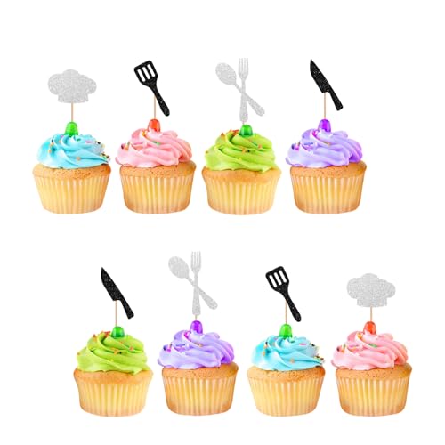 24pcs Chef Cupcake Toppers, Cooking Chef Cupcake Toppers for Masterchef Birthday, Black Glitter Cooker Cupcake Picks, Cook Themed Birthday/Baby Shower Party Supplies