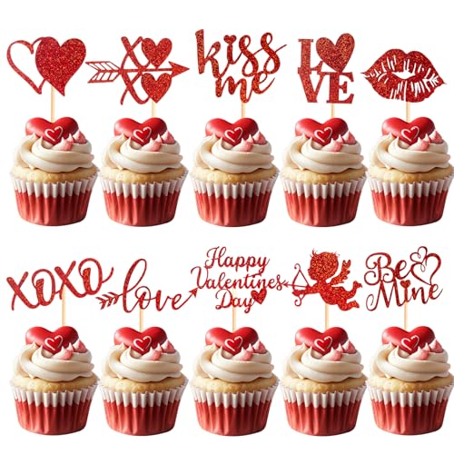 60 Pcs Happy ValentineCupcake Toppers,Glitter Cupid Love Heart Lip Kiss Me Be Mine XOXO Cupcake Picks for Valentine Theme Wedding Party Cake Decorations Supplies,Red