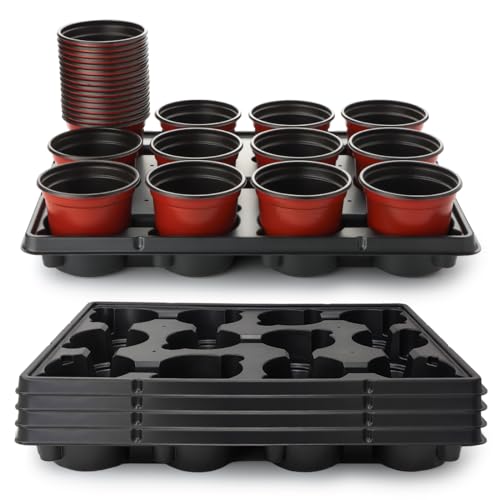 12 Cell Round Nursery Pots Tray, Plant Pot Shuttle Carry Holder and Trays for 4 inch Round Plastic Nursery Pots Flowerpot Carrier Transporting (16.75" 12.43", 2.1" Deep, 5-Pack)
