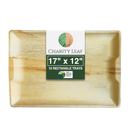 Charity Leaf Disposable Palm Leaf 17" x 12" Rectangle Trays (10 Pieces) Bamboo Like Serving Platters, Disposable Boards, Eco-Friendly Dinnerware for Weddings, Catering, Events