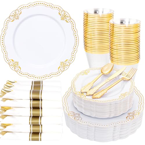 Ciaell 300PCS White and Gold Plastic Plates - Gold Disposable Dinnerware Sets for 50 Guests - 100 Plates, 50 Knives, 50 Forks, 50 Spoons, and 50 Napkins for Wedding, Anniversary, Party