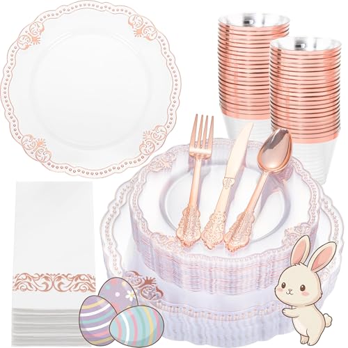 Ciaell 175 PCS Rose and Gold Plastic Plates - Fancy Rose Gold Disposable Dinnerware Set with of 50 Plates, 25 Knives, 25 Forks, 25 Spoons, 25 Cups, 25 Napkins for Wedding & Party & Easter