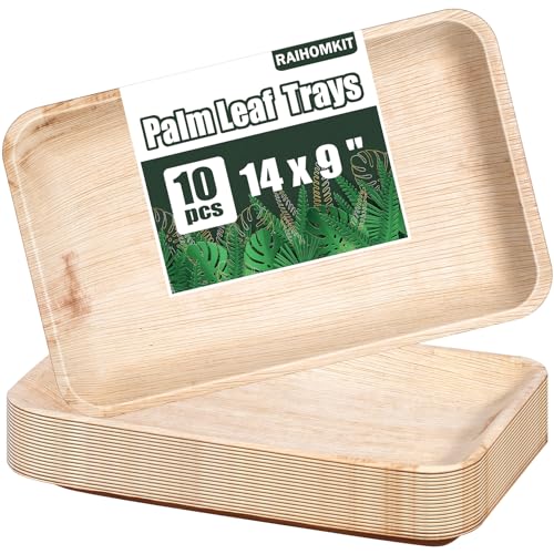 10 Pack Disposable Palm Leaf Trays,Bamboo Like Serving Platters,Disposable Charcuterie Boards,Rectangle Tray,Palm Leaf Plates,Eco-Friendly Platters for Weddings Catering (14" x 10")