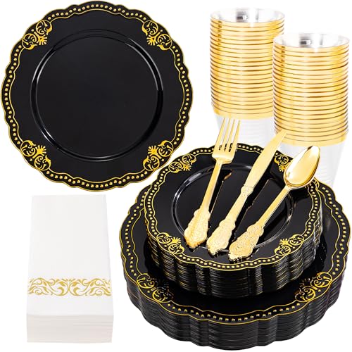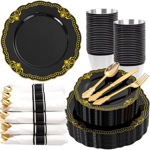 Ciaell 175 PCS Black and Gold Plastic Plates - Black Disposable Dinnerware Set with 50 Plates, 25 Knives, 25 Forks, 25 Spoons, 25 Cups, 25 Napkins for Parties and Weddings