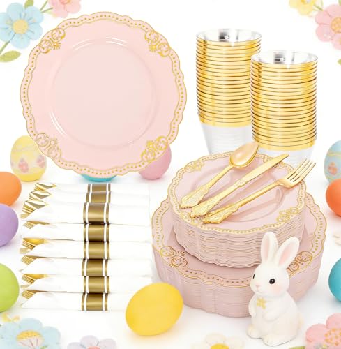 Ciaell 350 PCS Pink Plastic Plates - Pink and Gold Disposable Plates Include 50 Disposable Plate, 150 Heavy Duty Silverware, 50 Cups, 50 Napkins for Wedding & Party & Anniversary & Easter