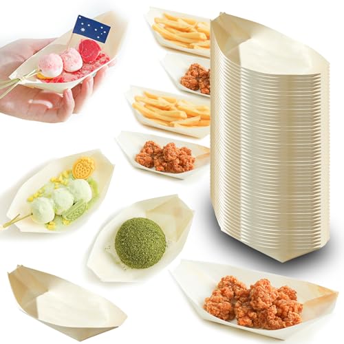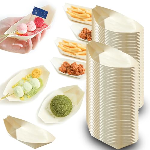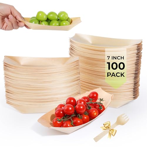 100-Pack Upgraded Thick Wooden Disposable Plates 7IN Thickened Boat Plates Food Trays with 0.8lb/360g Load Capacity Sturdy Food Boats for Party (Actual Size Used: 3.94"L x 2.28"W x 0.79"H)