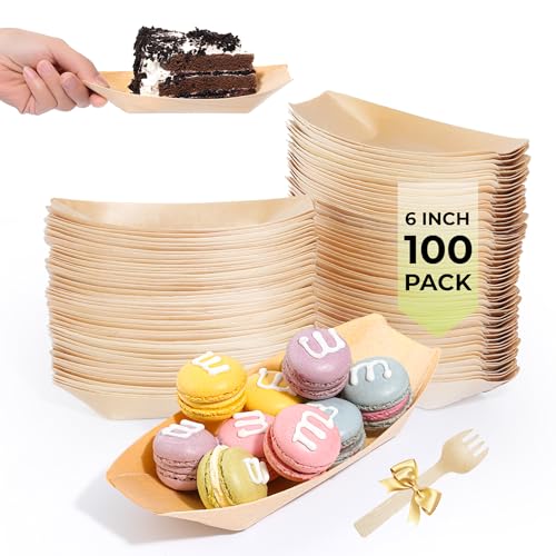 100-Pack Upgraded Thick Wooden Disposable Plates 6IN Thickened Boat Plates Food Trays with 0.7lb/305g Load Capacity Sturdy Food Boats for Party (Actual Size Used: 3.39"L x 1.97"W x 0.63"H)