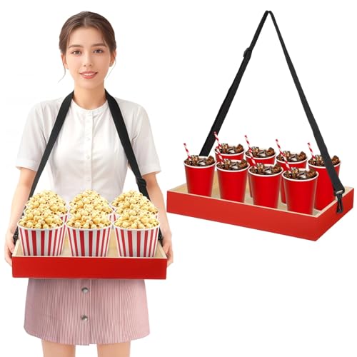 Wooden Snack Trays with Strap 15 x 11 x 2 Inch Movie Night Party Serving Trays Usherette Popcorn Drink Vending Concessions Tray Beverage Carrier for 20's Theme Costume Carnival Prop(Red)