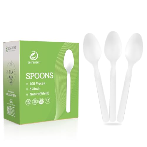 Compostable Spoons [100 Pcs] No Plastic Spoons Disposable BPI Certified BPA-Free, Heat Resistant, Heavy Duty Biodegradable Spoons Disposable Utensils for Daily, Party & Camping