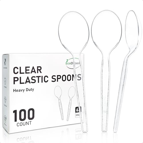 EcoDispose 100 Count Disposable Clear Plastic Spoons Heat Resistant and BPA Free, Heavy Duty Durable Disposable Cutlery for Party Event Supply