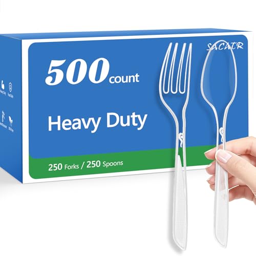 SACATR 500 Count Plastic Silverware Heavy Duty -250 Forks, 250 Spoons,BPA-Free,Heat Resistant Disposable Plastic Spoons Bulk, Solid Durable Premium Cutlery for Parties, Events and Everyday Use