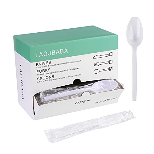 Plastic Spoons Disposable Individually Packaged Spoon White 7Inch Commercial Take Away Spoons Heavy Individually Wrapped 100 PCS