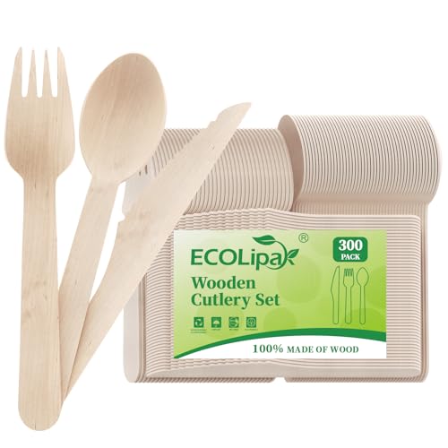ECOLipak 300 Count Disposable Wooden Cutlery Set, 100 Knives, Forks and Spoons each, Splinter-Free Compostable Wooden Disposable Utensils for Party, Camping, Traveling, Family Dinners