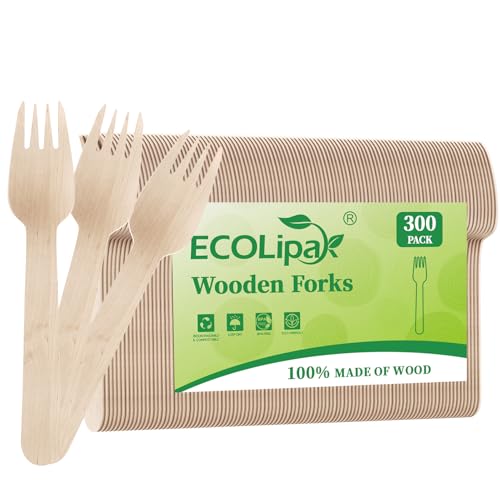 ECOLipak 300 Count Wooden Forks Disposable, Wooden Disposable Compostable Forks for Eating, Party, Camping, Traveling, Family Dinners
