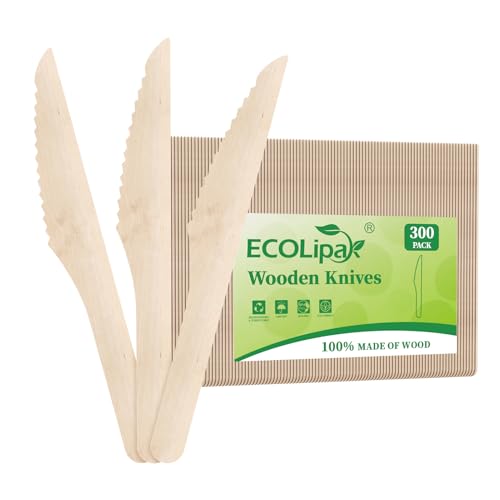 ECOLipak 300 Count Disposable Wooden Knives, Wooden Compostable Disposable Knives for Party, Camping, Traveling, Family Dinners