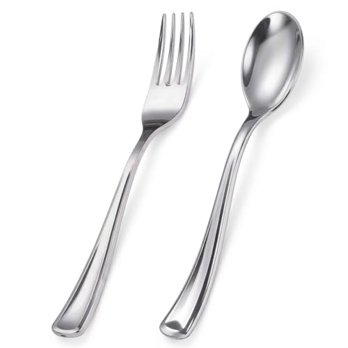 Goodluck 100 PCS Silver Plastic Silverware, Heavy Duty Plastic Cutlery Includes 50 Forks and 50 Spoons, Elegant Disposable Utensils, Durable Flatware for Parties, Weddings Catering and Dinners