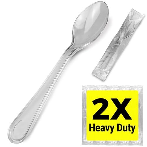 2X Heavy Duty Clear Plastic Spoons Individually Wrapped 100 Count, Sturdy Like Silverware, Perfect for Event Catering, Party, and Take out.